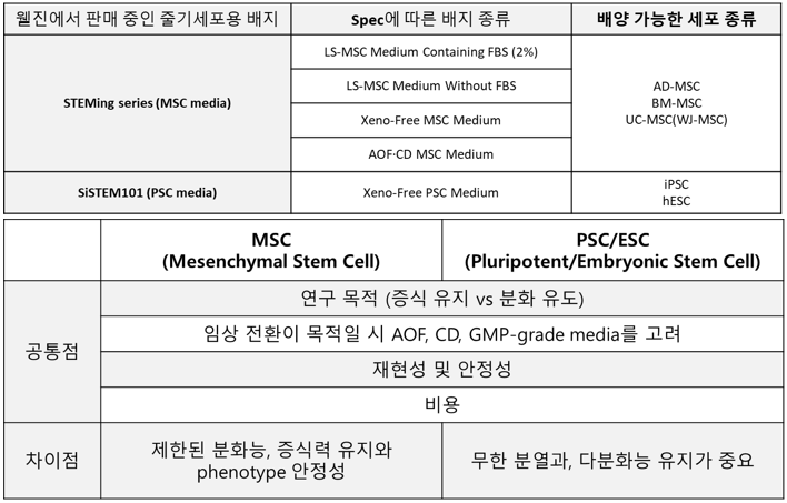 hMSC, iPSC, ESC 등 세포 종류별로 media 선택 기준은 무엇인가? ● 종류와 목적에 따라 필요한 배지의 성분과 기능이 달라지므로, 각 줄기세포의 특성에 맞는 배지를 선택하는 것이 중요