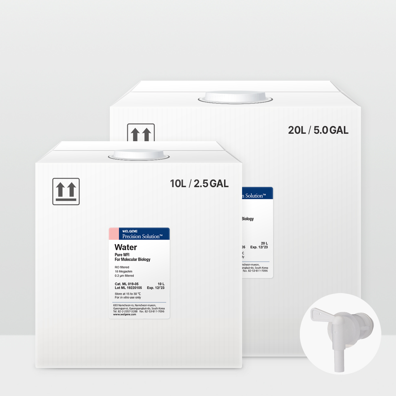 ML 019-05 is ultra pure water prepared through reverse osmosis(RO) filteration, 2-step endotoxin filteration, and has the conductivity (resistance) of max. 18 MΩ. By these processing, impurities as well as microbes are removed completely hence the experimental errors due to lab water can be reduced and the high reproductivility can be provided. Ultra Pure Water may be used for dissolving powder reagents, reactions, such as PCR (polymerase chain reaction), ligation, restriction enzyme, and other variable molecular biology experiments.