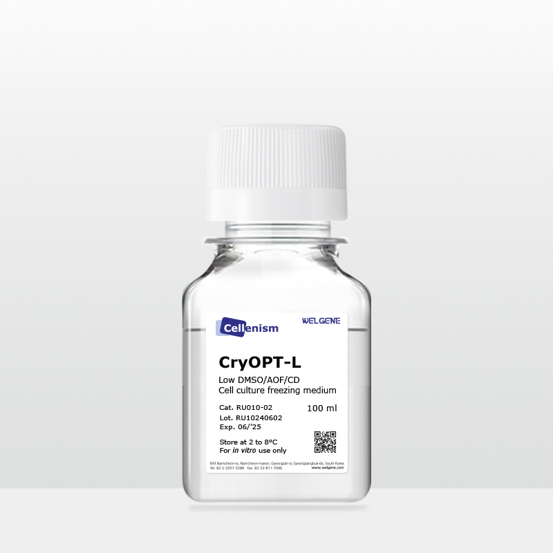 낮은 농도의 DMSO가 포함되어 있는 CryOPT-L (RU010-02)은 세포를 안전하게 동결 보존할 수 있는 최첨단 동결 보존제로서 세포 치료제 및 유전자 치료 응용 분야에서의 연구를 위해 개발되었으며, 동물성 성분이나 단백질, phenol red를 포함하고 있지 않은 화학적으로 정의된 배지입니다.