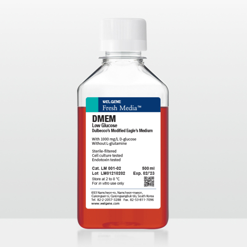 Dulbecco’s Modified Eagle’s Medium(DMEM)는 Minimum Essential Medium(MEM)을 기반으로 아미노산과 비타민의 농도를 높이고, D-glucose(저농도: 1000 mg/L 또는 고농도: 4500 mg/L)와 같은 추가적인 보조 성분을 포함하여,