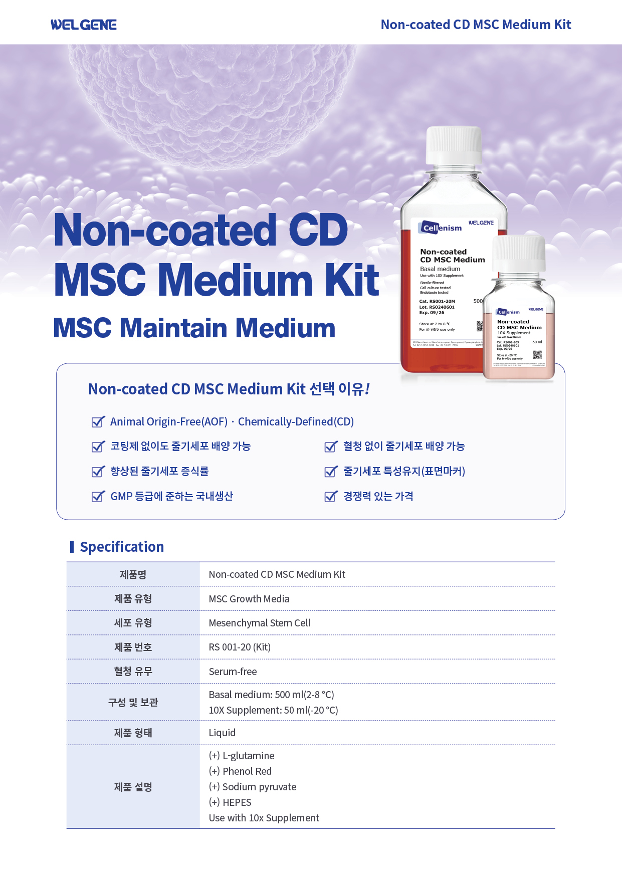 Non-coated CD MSC Medium Kit은 동물유래성분불포함 (Animal Origin-Free, AOF)·화학적 규명(Chemically-