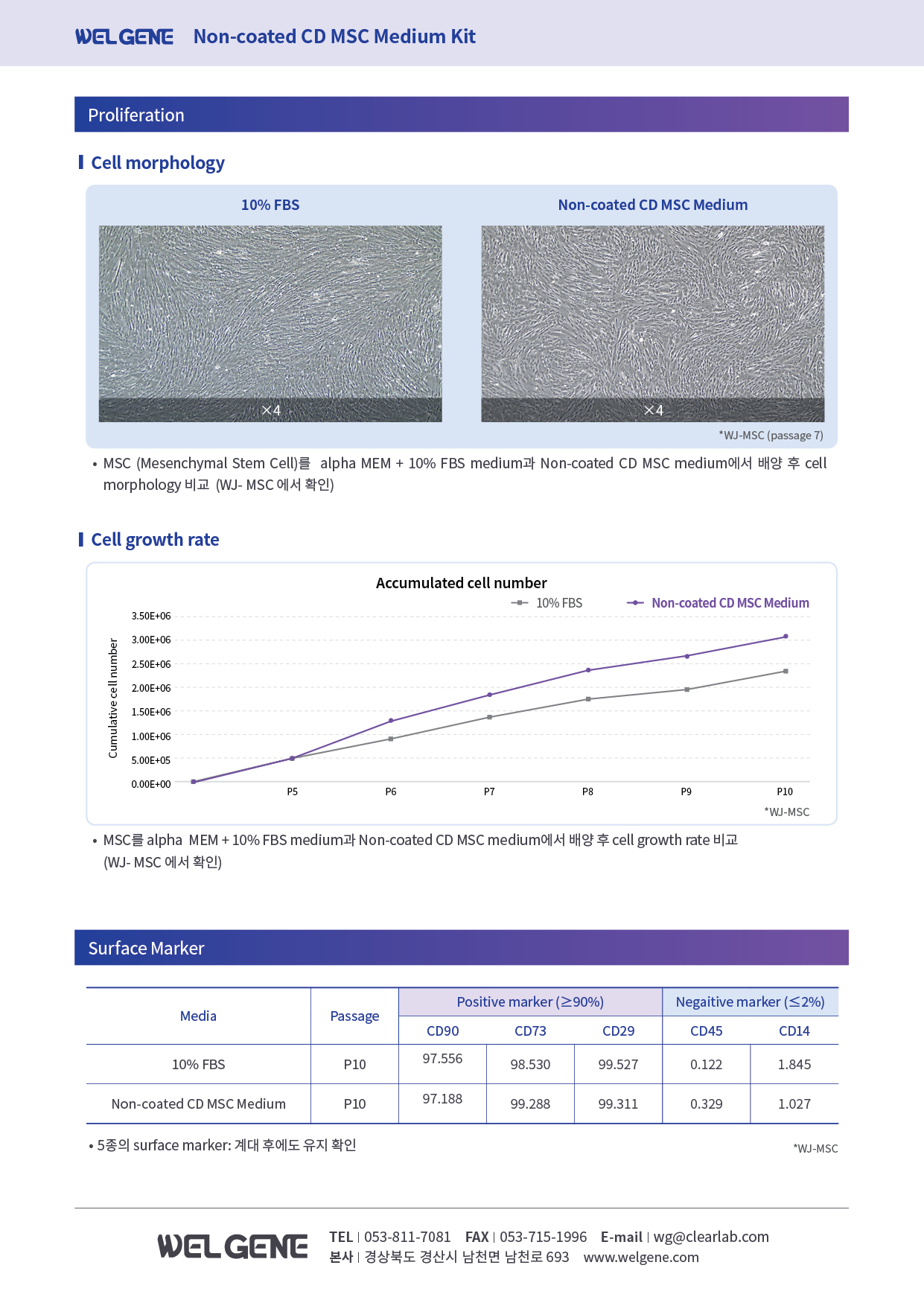 감염 요소 등)을 방지하기 위해 혈청 사용을 하지 않고 세포 성장을 유지하는 것이 중요한데, Non-coated CD MSC Medium Kit을 사용하면 MSC의
