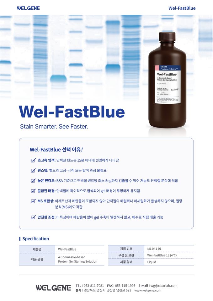 Coomassie Brilliant Blue G-250 기반의 Protein Gel Staining Solution인 Wel-FastBlue는 SDS-PAGE 이후 15분 내에 고감도 단백질 밴드 염색이 가능하고, 별도의 탈색 과정 없이 바로 시각화 가능한 솔루션을 제공할
