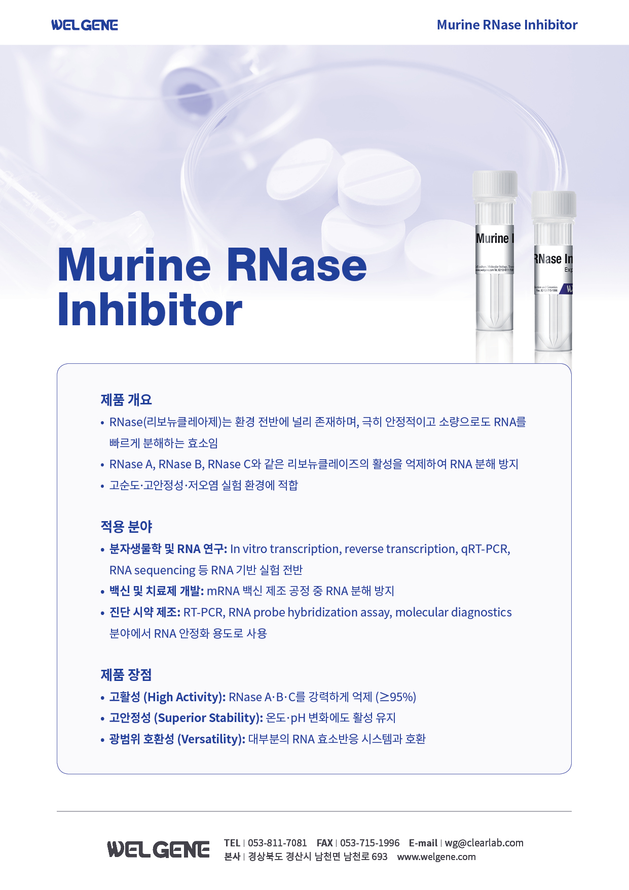 Murine RNase inhibitor는 RNase와 1:1 비율로 비공유 결합하며, 높은 친화도로 RNase A, B, C를 특이적으로 억제하는 효소입니다. 또한, 이 효소는 Taq DNA Polymerase, AMV 또는 M-MLV 역전사효소, 또는 파지 RNA Polymerase(SP6, T7 또는 T3)와 함께 사용할 경우 중합효소 활성 저해가 관찰되지 않습니다.