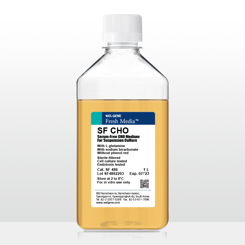 SF 486 contains 4500 mg/L D-glucose, 7.5 mM HEPES, L-glutamine, and sodium bicarbonate. Pluronic® F-68 is supplemented to prevent damage to CHO cells in a suspension culture, along with hypoxanthine and thymidine. SF 486 vary in their compositions and consequently yield different effects on different cell lines. The optimal product for a certain cell type can only be confirmed through direct application. SF 486 contains the minimal amount of reagents of animal origin, thus making them appropriate for the research and production of medical quality recombinant proteins. In selecting the appropriate culture environment of Serum-Free Medium, (1) the origin of the cell host (the kind of cell), (2) the type of culture container to be used (tissue flask, multiplayer flasks, roller bottle, spinner flasks, or bioreactors), and (3) the characteristics of the CHO cell line is important factors to be considered.