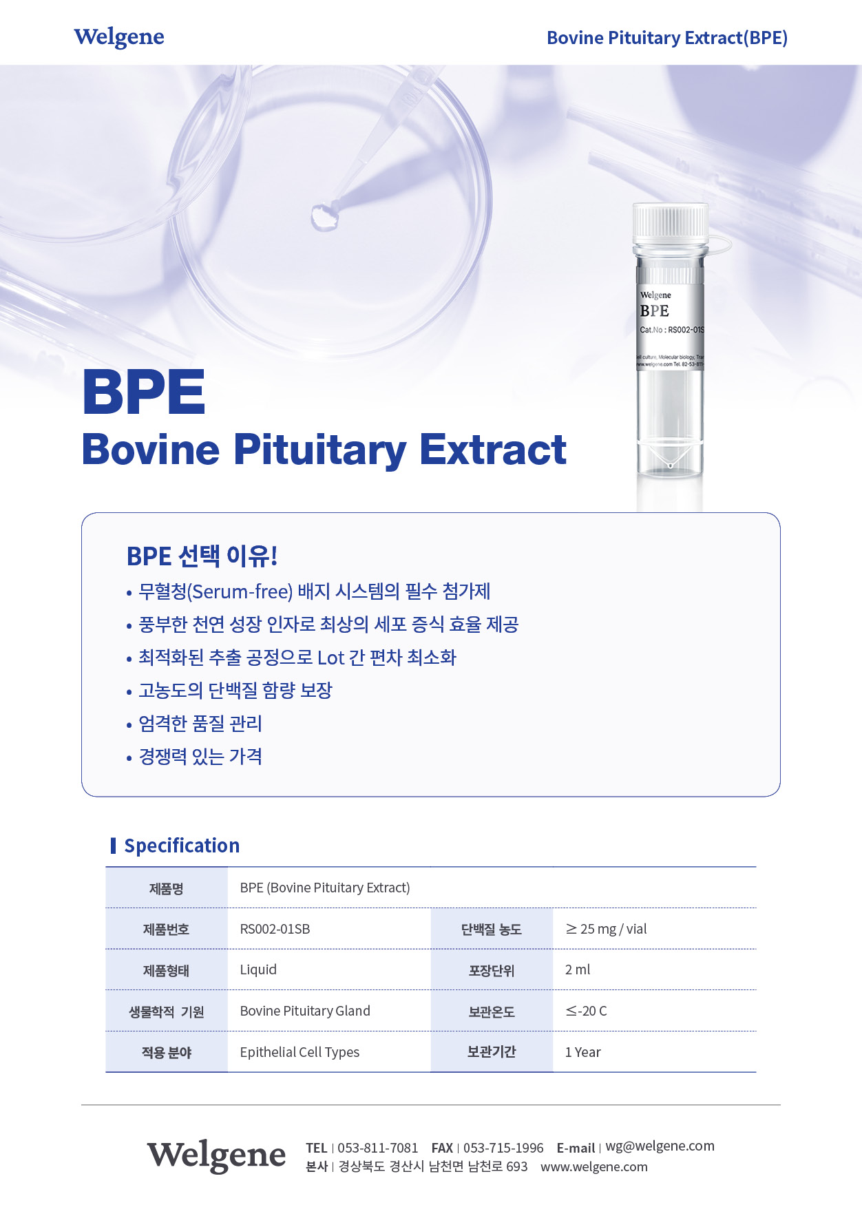 BPE는 냉동조건 (-20°C)에서 보관하여야 합니다. 제품 사용 시 단백질 변성을 방지하기 위해 반복적인 해동 및 재동결을 피해야합니다.