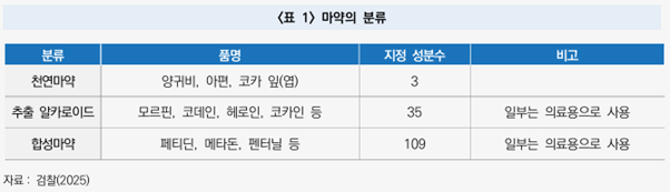 - 마약은 추출과 합성방식에 따라 천연마약, 추출 알카로이드, 합성마약으로 구분
